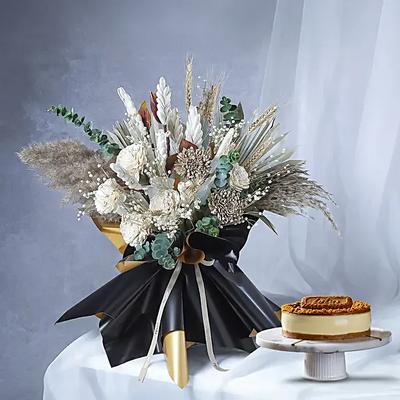 Indulge your loved one with this exquisite gift featuring a rich and flavourful lotus biscoff cake paired with a beautifully handcrafted bouquet of white sola belli natural sola dried flowers and sola leaf dried flowers. Enhanced with tishi grass natural pampas grass and fresh green eucalyptus leaves it exudes rustic charm. Wrapped in a sophisticated golden and black plastic sheet this thoughtful ensemble is a delightful way to celebrate any special occasion with love and style.