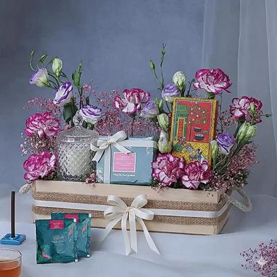 Ans – Our hampers typically feature a primary floral arrangement (like roses, lilies, or carnations) paired with premium add-ons such as artisanal chocolates, plush toys, or scented candles.