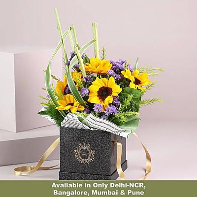 This Valentine's Day flowers bring a dash of sunny happiness and positivity to your partner's life with our vibrant Sunflower Splendor. With sunflowers backed by the essence of purple daisies and delicate yellow buttons, this bouquet is a one-of-a-kind present for anyone. Go with the hand-tied arrangement, or pick a chic glass vase for a lovely centrepiece for your living room table.