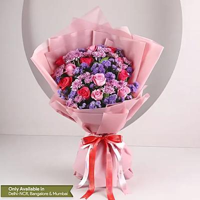What could be more charming than a beautiful arrangement of soft pink roses and vibrant purple daisies tied together in a gorgeous floral bouquet? Adorned with a renowned Mygiftsy ribbon, this arrangement is ideal for a birthday celebration or a romantic night. If picking for your girlfriend, add a chic floral-shaped personalised necklace for a heartfelt romantic present.