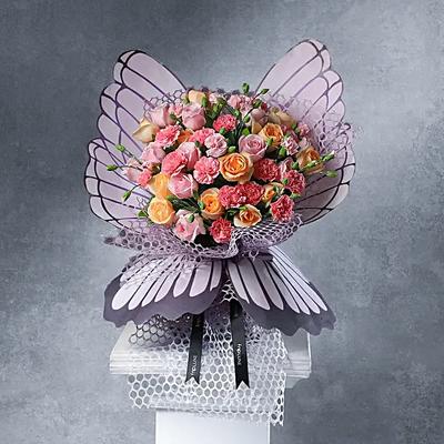 Similar to Butterfly Garden, this floral arrangement is also wrapped in a butterfly-shaped mesh, offering an exotic and unique look. Baby pink carnations, avalanche roses and the detailing with peach roses are a beautiful combination for a grand romantic gesture. To say this magnificent combo is a perfect Valentine's Day flower option would be an understatement.