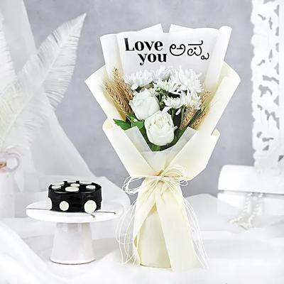 Embrace the warmth of paternal love with our \"Love You Appa\" bouquet and truffle cake combo. The pristine white roses and a delicate daisy symbolises purity, while the customised message adds a deeply personal touch, expressing affection in his language. Paired with our decadent truffle cake, its a unique blend of love and indulgence, promising to brighten his day with joy and cherished memories.